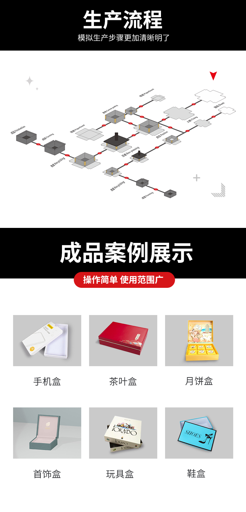 適合各種天地蓋的自動(dòng)生產(chǎn)線,故障診斷功能,自動(dòng)吸送面紙和送灰板功能,高精度凸輪飛達(dá)送紙,整機(jī)采用松下伺服控制系統(tǒng),視覺(jué)定位系統(tǒng)及機(jī)器抓取,采用雅馬哈機(jī)器人,采用全新循環(huán)溫控上膠系統(tǒng),采用高清攝像頭定位可精準(zhǔn)定位天地盒、灰板、皮殼。